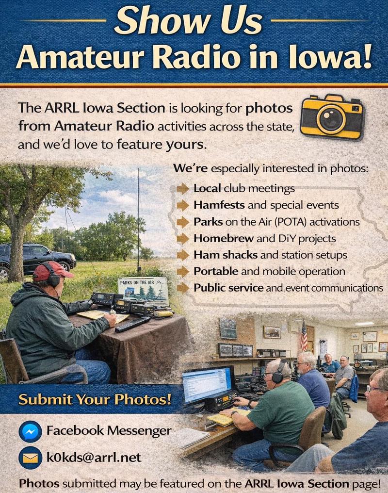 By submitting photos, you grant permission for them to be shared on the ARRL Iowa Section Facebook or Instagram page, with credit given when possible.
